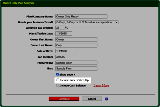 üThe "Super Catch-Up" option has been added to the Owner Only Plan Analysis. Selecting this option will increase the current Catch-Up limit by 150% for eligible participants aged between 60 to 63 years old.