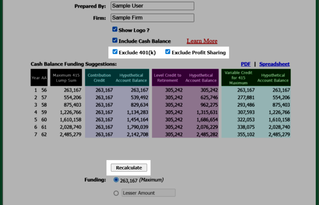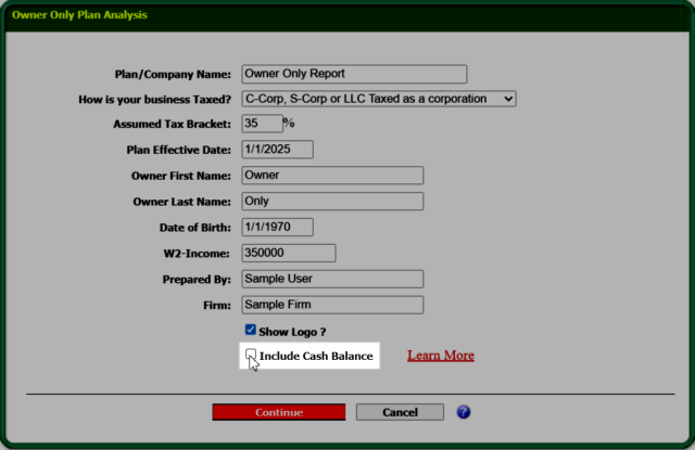 In the Owner Only Plan Analysis screen, check the "Include Cash Balance" check box if you want to include the Cash Balance Contribution in the report.