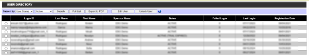 The User Directory page is used to display all the users associated to the sponsor group/company.